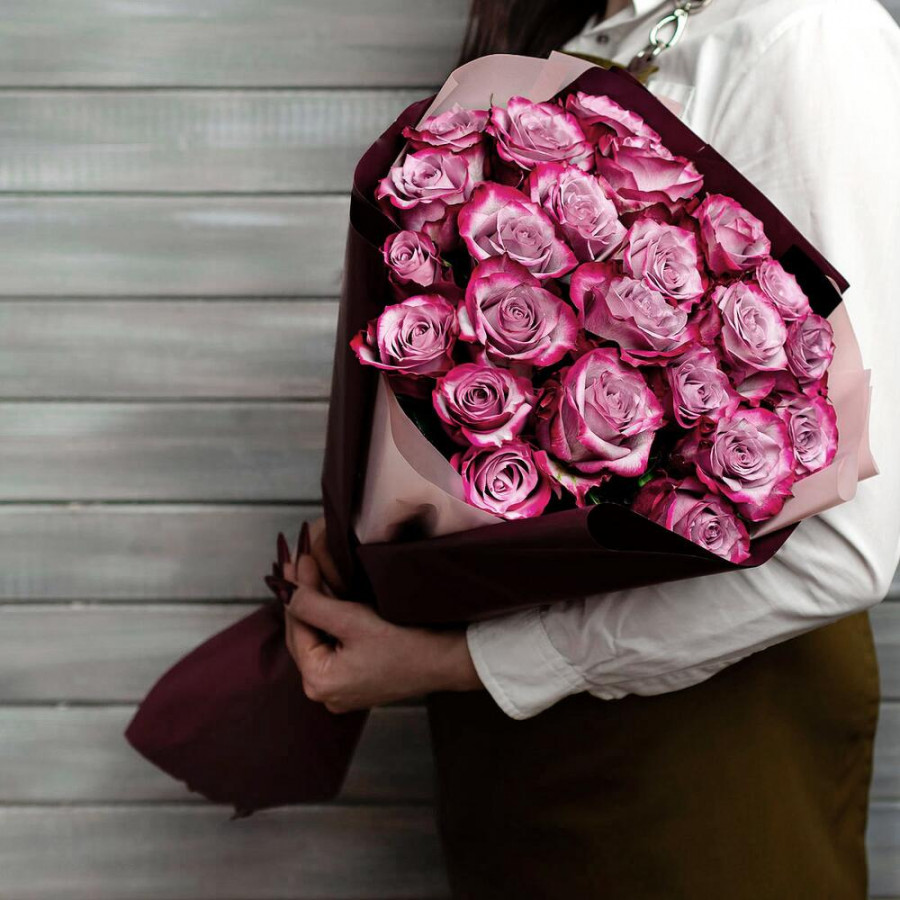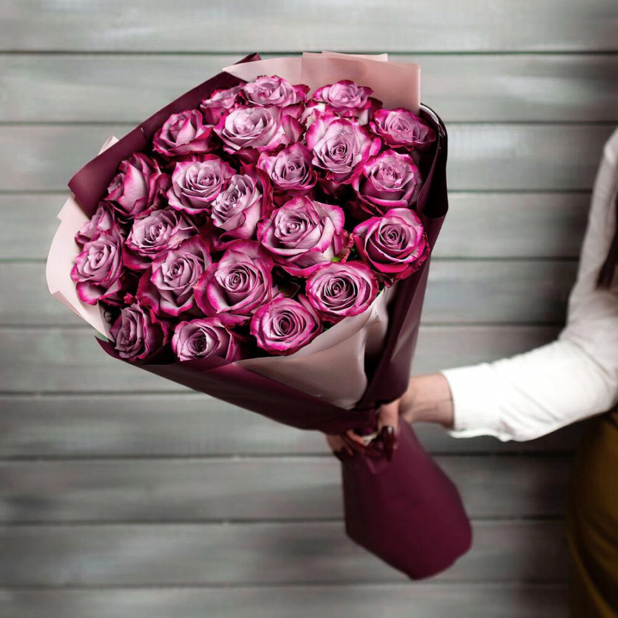На фото букет из 23 фиолетовых роз. В составе: роза 23 шт, дизайнерская упаковка 1 шт, атласная лента 1 шт, . Все цветы свежие и ароматные, букет красиво оформлен и отлично подходит для подарка. Доступна доставка цветов или самовывоз.