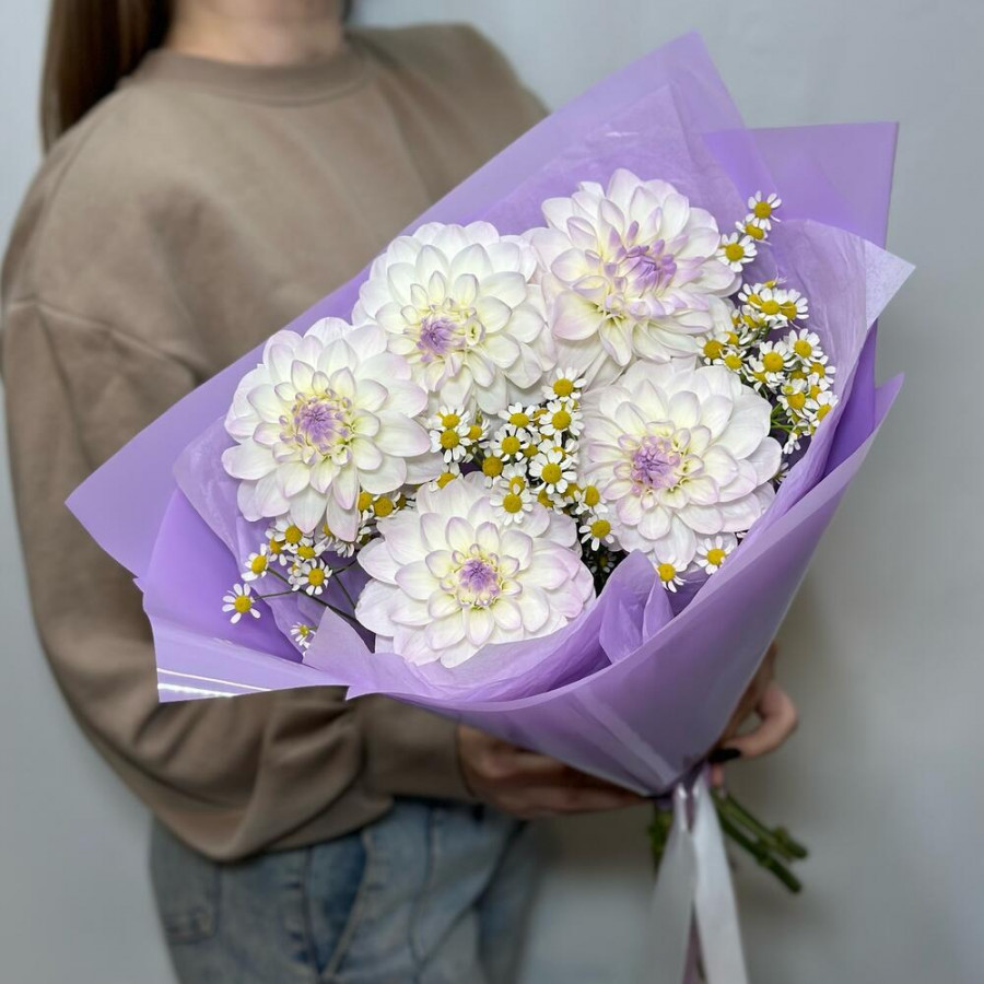 На фото букет из 5 белых георгин с ромашками. В составе: георгина 5 шт, танацетум 3 шт, дизайнерская упаковка 1 шт, атласная лента 1 шт, . Все цветы свежие и ароматные, букет красиво оформлен и отлично подходит для подарка. Доступна доставка цветов или самовывоз.